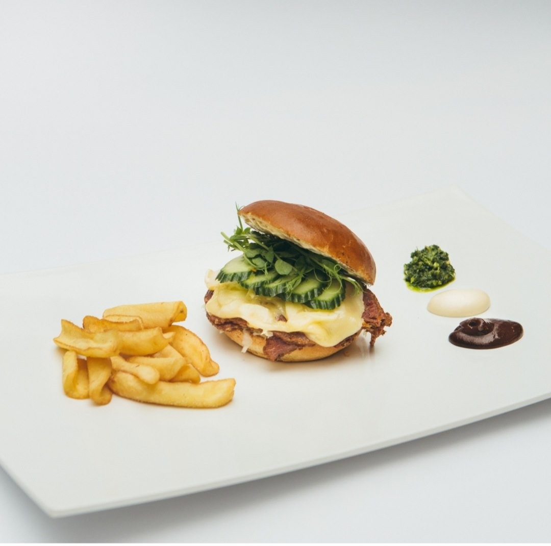 wiejski chleb, długo marynowana wołowina, raclette, kiszona kapusta, dressing rosyjski.
